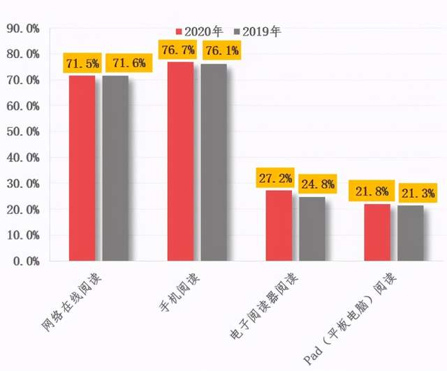 根据第十八次全国国民阅读调查,2020年在数字化阅读方式中,只有27.2%的人们选择使用电子阅读器进行阅读,而同一时间手机的阅读率翻了近三倍。