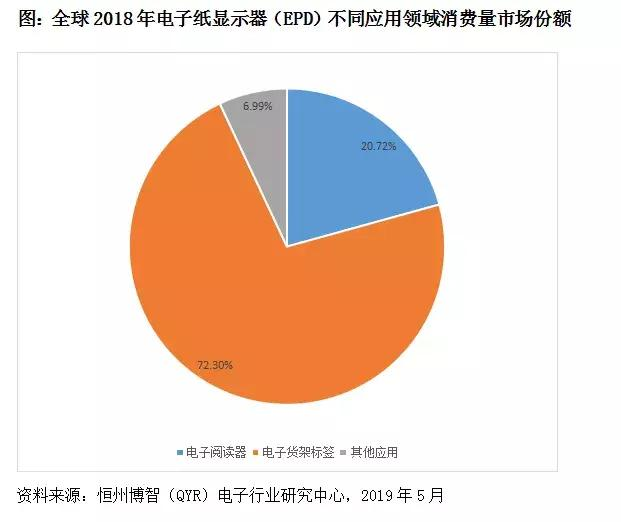 据恒州智博,2018年全球电子纸显示器不同应用领域中,电子阅读器以72.3%的市场份额名列第一,电子货架标签则以20.72%的份额排在第二,用于其他应用的电子纸仅占总消费量的3.99%。