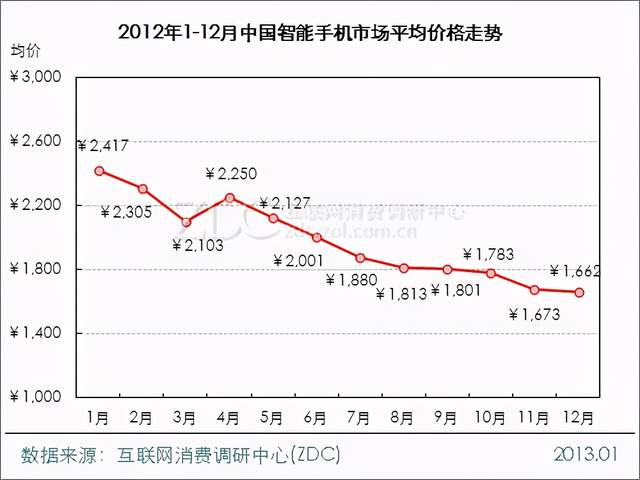 根据互联网消费调研中心,2012年1-12月中国智能手机市场均价呈直线下降走势,7月均价跌破2000元大关,且持续下降,年尾较年初价格下降了31%左右。