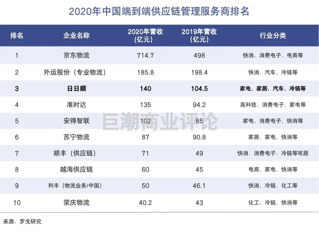 根据罗戈研究的报告,按照2020年的收入,日日顺已经成为中国第三大“端到端供应链管理服务商”,也是当前市场上少有的能够从B到C再到消费者服务的供应链管理企业。