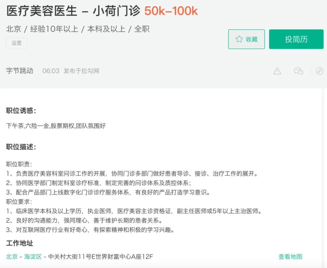 目前,小荷门诊正在招聘医疗美容医生和医美护士。