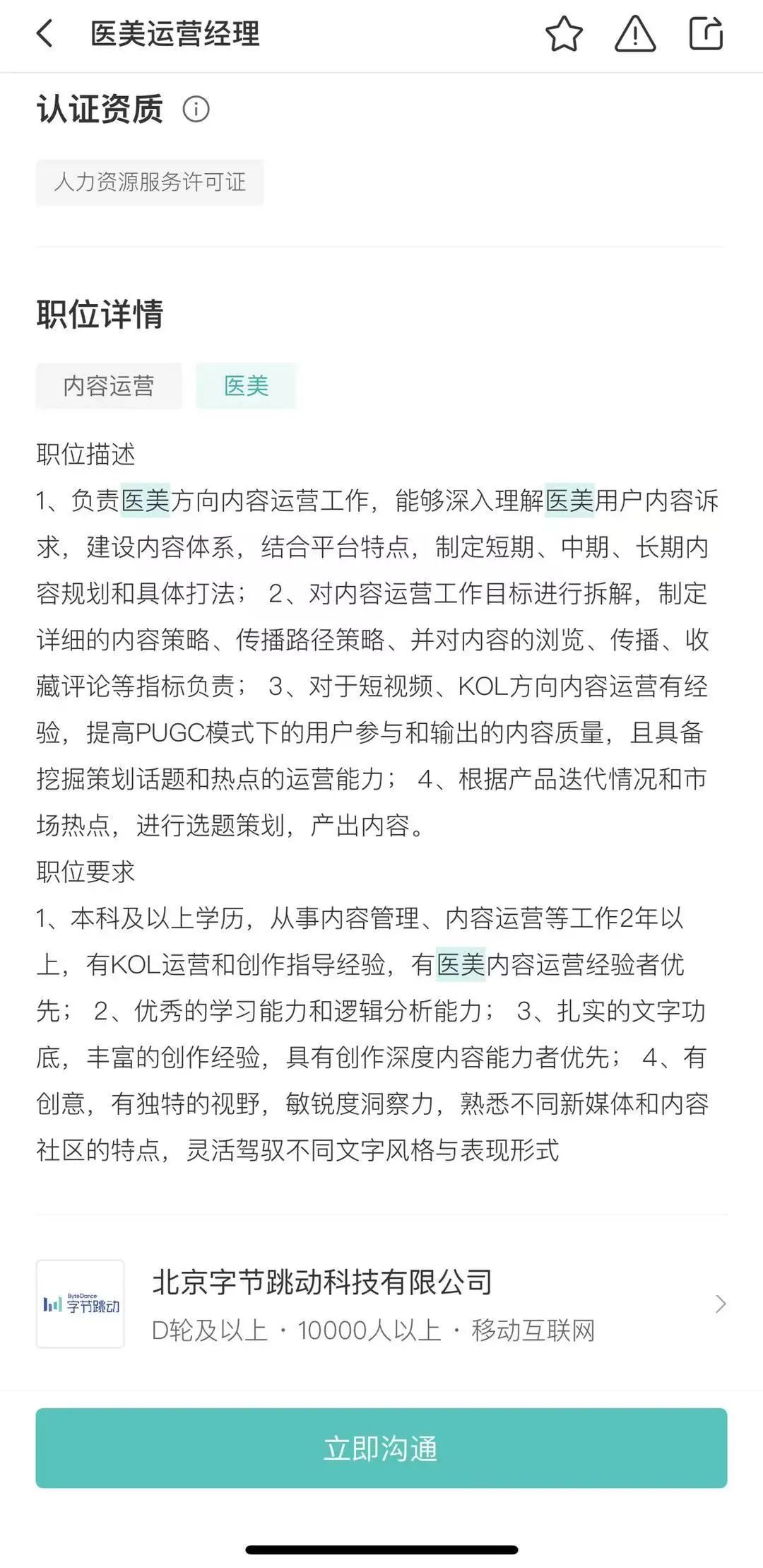 字母榜查询到,在去年年底,字节跳动就曾招聘医美业务实习生,主要职责就包括负责医美服务的引入和入库。另外,招聘平台显示,近期字节跳动正招聘医美运营经理,负责医美方向内容运营工作,职位介绍未显示该职位归属于哪一业务部门。