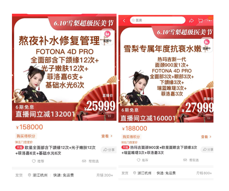 如今,淘宝主播们也开始在直播间卖医美产品。今年618期间,淘宝top主播雪梨就曾推医美节。字母榜查询到,一款在直播间售价27999元的组合套餐(含热玛吉、fotona 4D pro等项目)销售量超800件,销售额超2000万元;一款售价为25999元的组合套餐的销量也超200件,销售额超500万元。