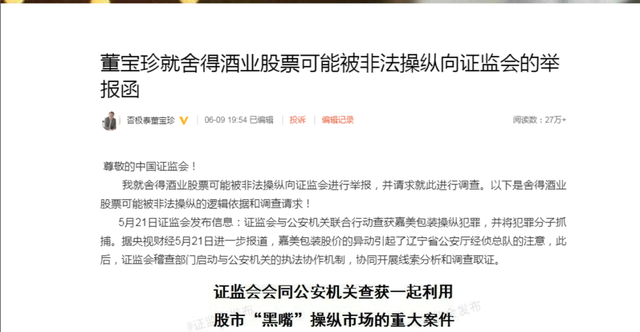 6月9日晚间,知名私募基金经理董宝珍在微博上发文称,根据其对舍得酒业股票走势图的分析,质疑可能被非法操纵,并请求证监会就此进行调查。