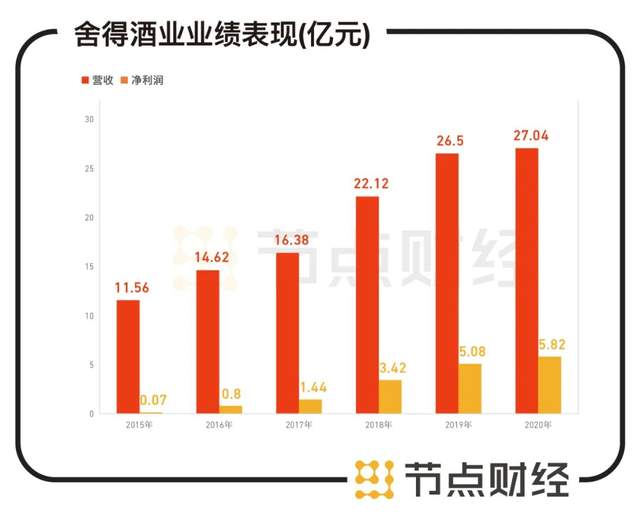 2020年,舍得酒业实现营收27.04亿元,归属净利润5.82亿元,在上市白酒企业中的排名分别为13位、11位。