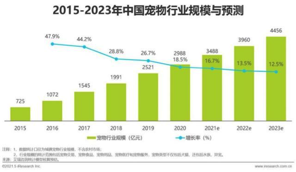 “铲屎官”们想给“毛孩子”好东西的想法,吸引了大笔热钱涌入赛道,促成了一桩3000亿的生意。《2021年中国宠物消费趋势白皮书》显示,2020年宠物经济规模已将近3000亿元,到2023年规模将达到4456亿元。