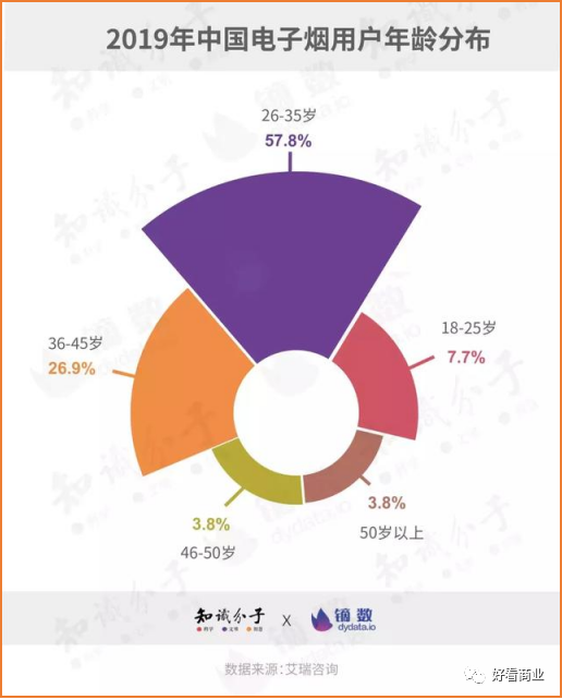 而艾瑞咨询发布的一份报告也提到,中国电子烟用户中,26-35岁的人占比最高,达57.8%;36岁以上的人占比34.5%。