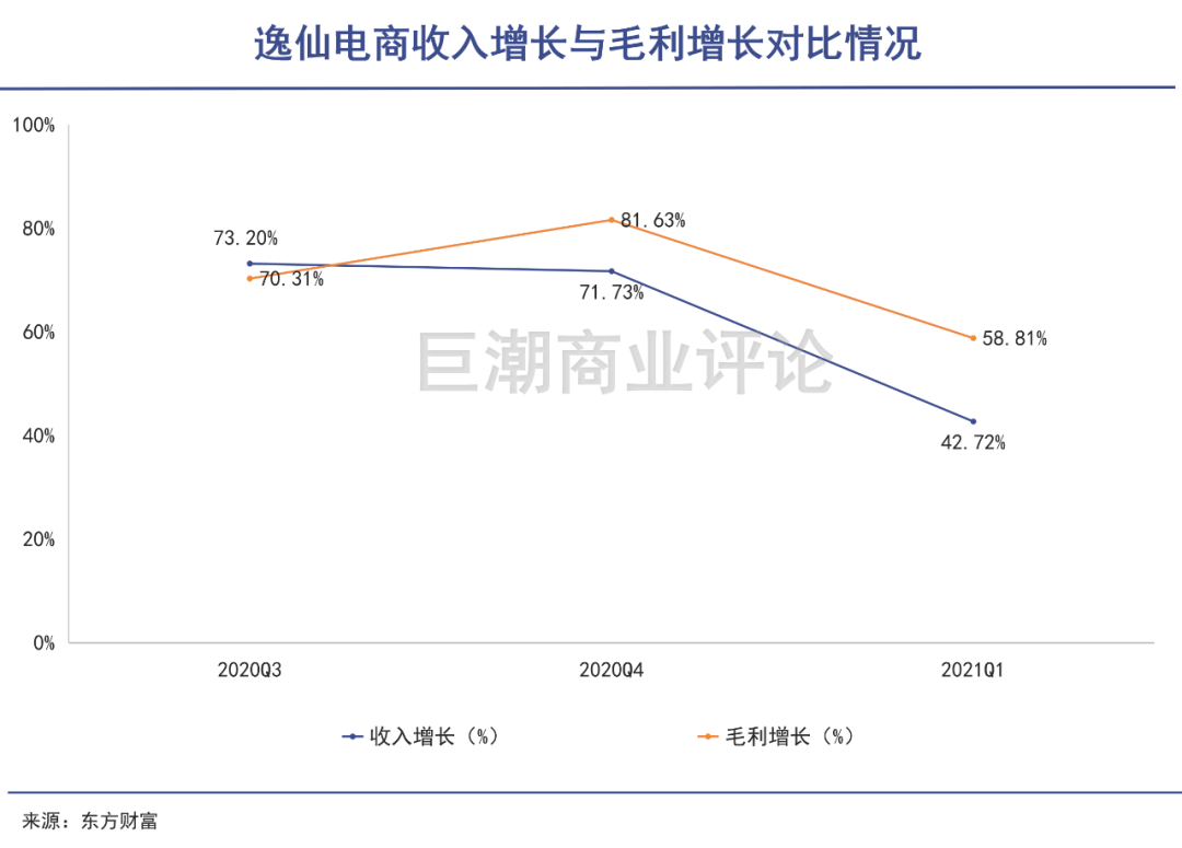 反映在财务数据上,其毛利增长、收入增长在2021年一季度都出现了明显的下滑——同一套营销策略在使用一年之后财务数据变得难看,意味着复购率有限,整体的转化率出了大问题,资本选择在此时逃离。