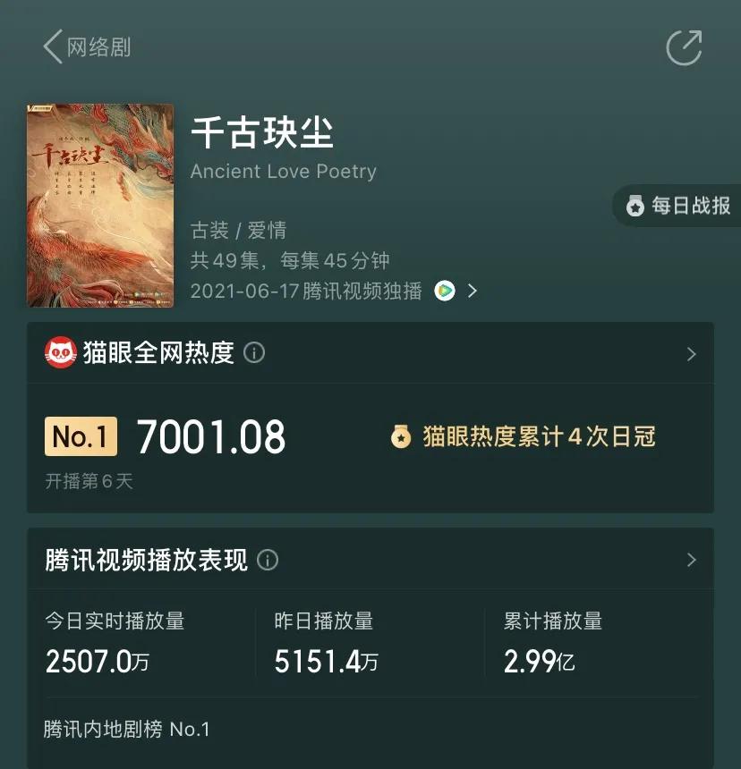 从选角到预告片释出再到正片上线,每逢《千古玦尘》有新的动作,都在微博、豆瓣等社交平台上,引发了不小的探讨声量。尽管这些探讨声是正负面夹杂着,但不可否认的是,《千古玦尘》实打实地收割了不菲的热度。据猫眼数据显示,上线五天,《千古玦尘》已经连续四日斩获了网络剧猫眼热度日冠。
