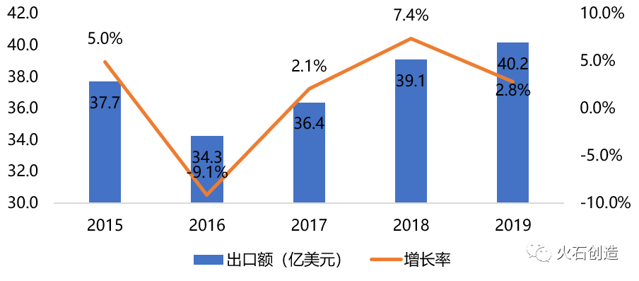 2019年中药出口规模达40.2亿美元,经过2016年的下滑后,2017-2019年均保持增长,五年间复合增长率1.3%,总体增长较为缓慢。