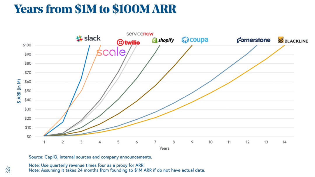 无疑是那条陡峭的橙色曲线——Scale。从0到估值73亿美元只用了五年,ARR从0到1亿美元只用了四年,Scale几乎是SaaS公司里最快达到这些数字的。
