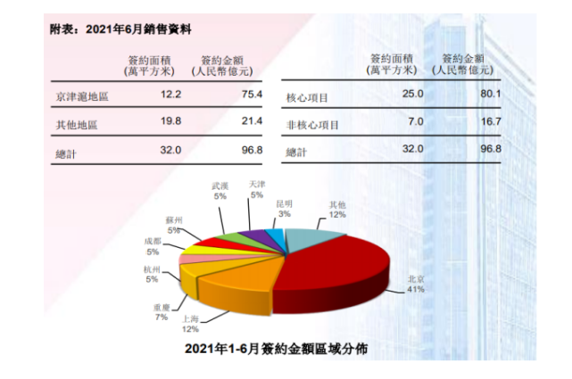 根据2021披露的半年报显示,公司一到六月实现销售面积32万平方米,而京津冀地区就达到了12.2万平方米。