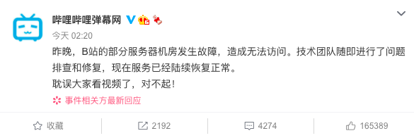 今日凌晨2时,B站官方微博发布消息,回应网站崩溃的原因,称是部分服务器机房发生故障,造成无法访问。技术团队随即进行了问题排查和修复,后续服务已经陆续恢复正常。