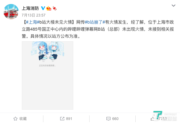 同时,上海消防官方半夜还在微博上针对该话题发布回应,称网传#b站崩了#有火情发生,经了解,位于上海市政立路485号国正中心内的哔哩哔哩弹幕网B站(总部)未出现火情,未接到相关报警。具体情况以站方公布为准。