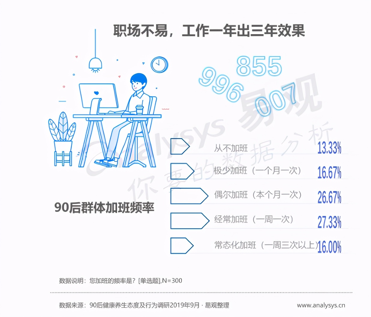 如果说,工作前年轻人是纯粹懒惰不愿意运动,那么工作后,则是因为没时间运动了。根据易观的《90后健康养生大揭秘》,有43.33%的90后一周加班在一次及一次以上。与此同时,据统计,我国有七成人存在过劳死的危险。