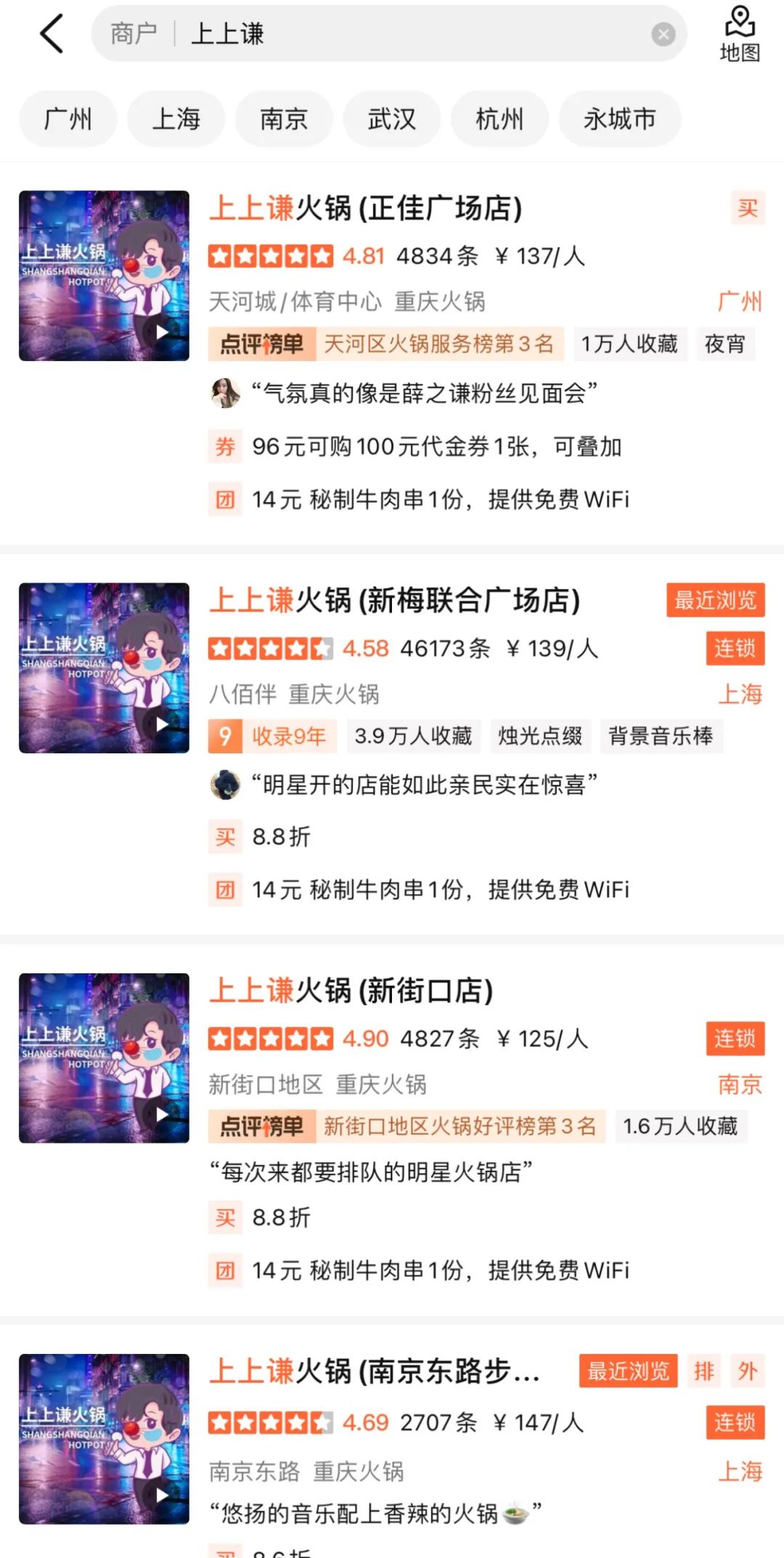 据连线Insight查询大众点评显示,只查到了6家上上谦门店,分别位于上海、广州、南京、武汉和杭州五个城市。