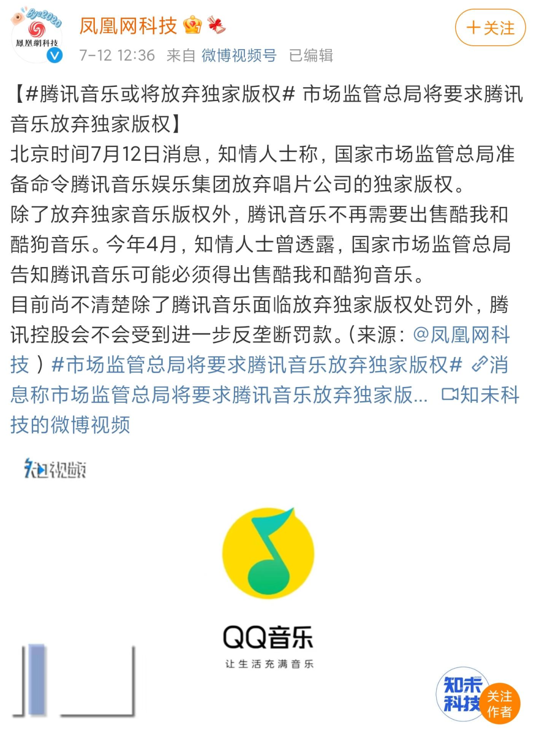 另外,据凤凰网科技报道,国家市场监管总局将要求腾讯音乐放弃独家音乐版权。这对于腾讯音娱集团来说,绝对是不小的打击,海量版权与独家版权已是腾讯音娱最大的优势。