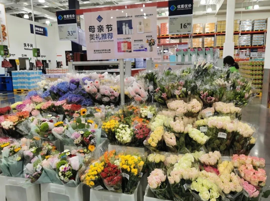 山姆会员店里,16.8元一捆粉玫瑰,6支百合卖30元。而在Costco,长度60厘米包含3-5种花材的A级混搭花束,不到五十就可以拿下。甚至像永辉这样的民生超市也在部分门店开辟了鲜花区域。