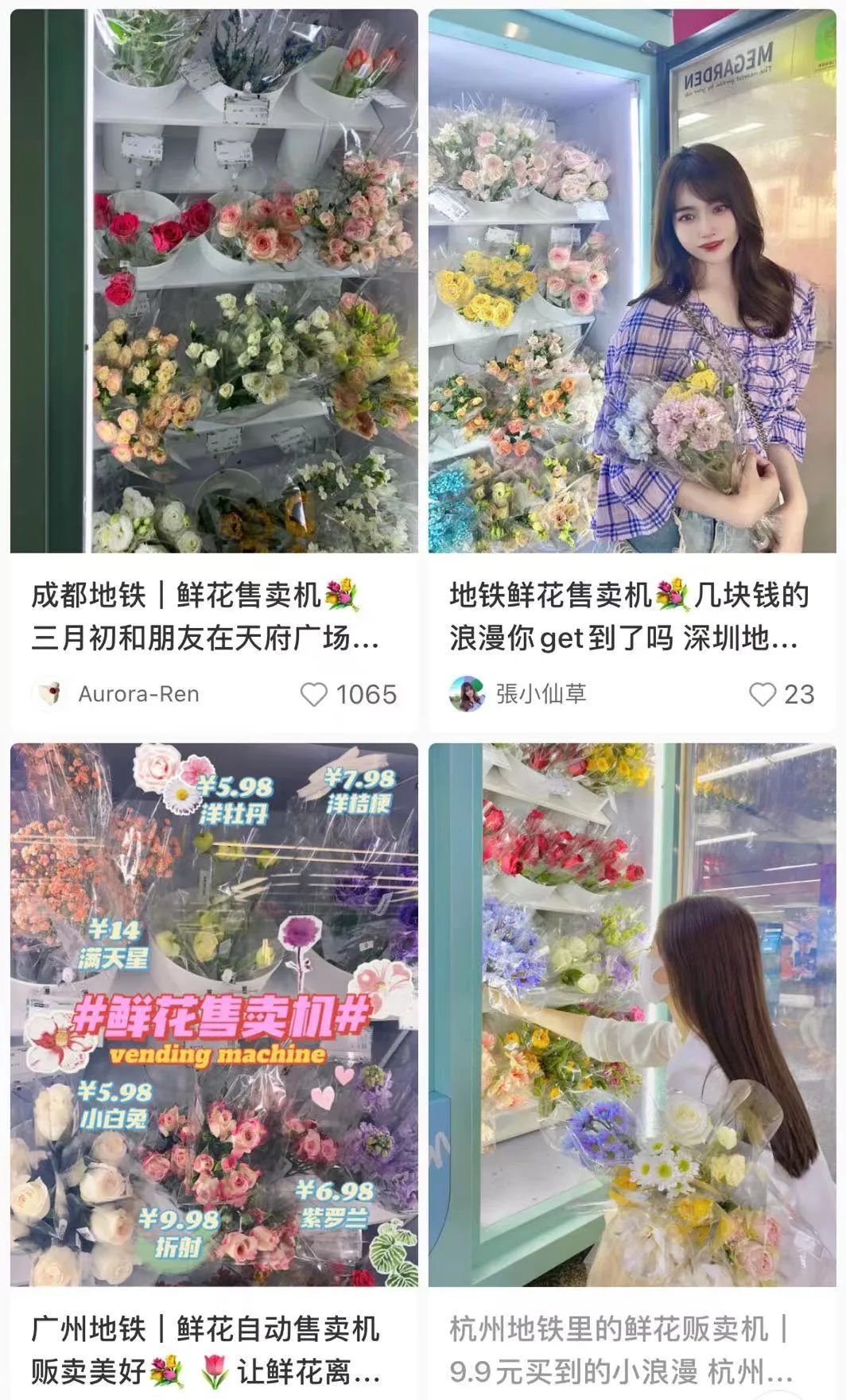 目前,这种自动贩售机已经覆盖了北京、上海、广州、深圳、杭州等多个城市的地铁站点,而在不少城市小区里,还兴起了可以自助购买的鲜花驿站。