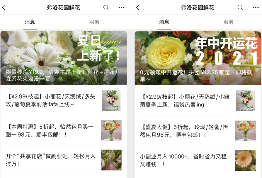即使这样,弗洛花园的官方微信依然还将北京地铁站的巨大吞吐量作为招商加盟的一大广告,翻阅相关推文的标题,不是「开个共享花店做副业,轻松月入过万!」就是「小副业月入10000+,省时省力又稳又赚钱!!」