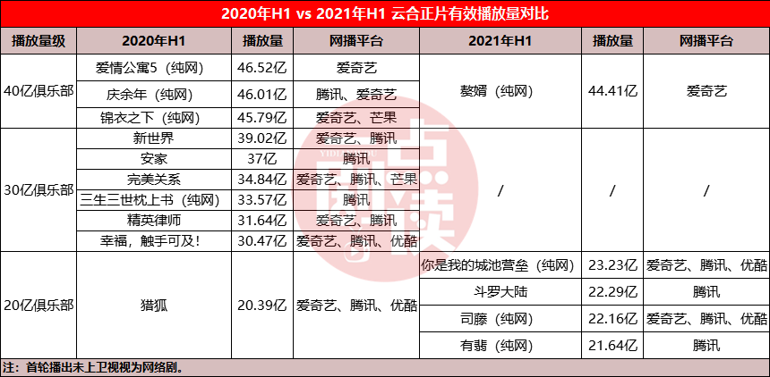 以同比来看,2021年上半年云合正片有效播放量踏入“40亿俱乐部”的作品仅一部爱奇艺独播网剧《赘婿》为44.41亿,“30亿俱乐部”成员空缺, “20亿俱乐部”成员有三部网剧和一部电视剧,第二位播放量断层下跌到23.23亿的《你是我的城池营垒》。Top20的末班车《叛逆者》累积正片有效播放不足10亿,同比2020年上半年Top20末班车的《月上重火》差距为2.51亿。