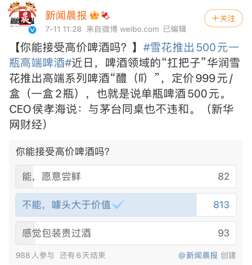 当然,相比这种答案,更有可能的是,华润的将啤酒卖到500元,及上了热搜获得了一波关注,又做出了超高端啤酒的准入门槛。