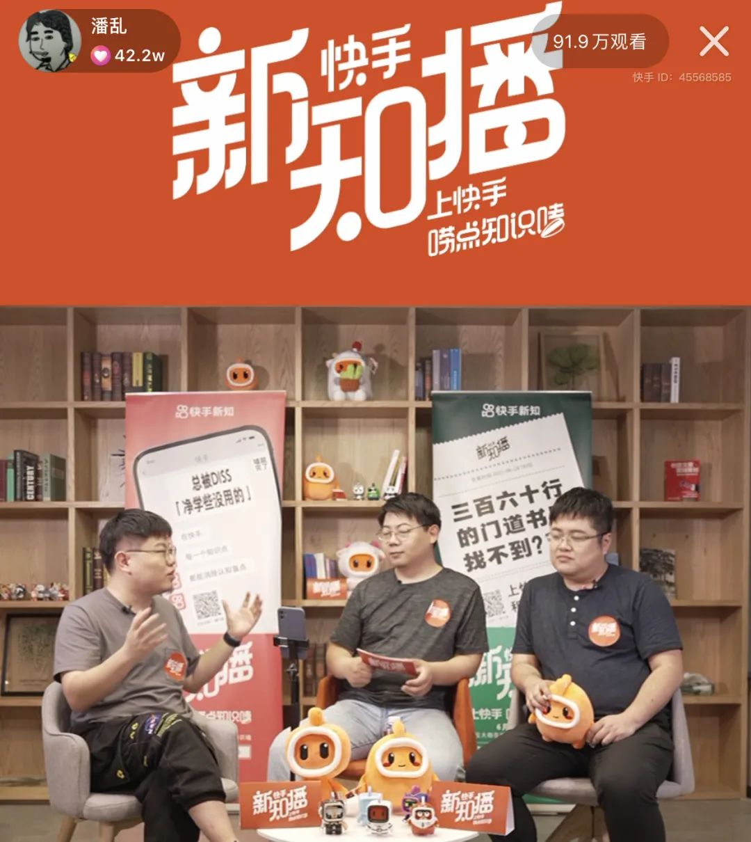 6月24日,科技评论作者潘乱与经纬中国副总裁庄明浩、高的创服合伙人金叶宸进行了“快手新知播”首场直播。