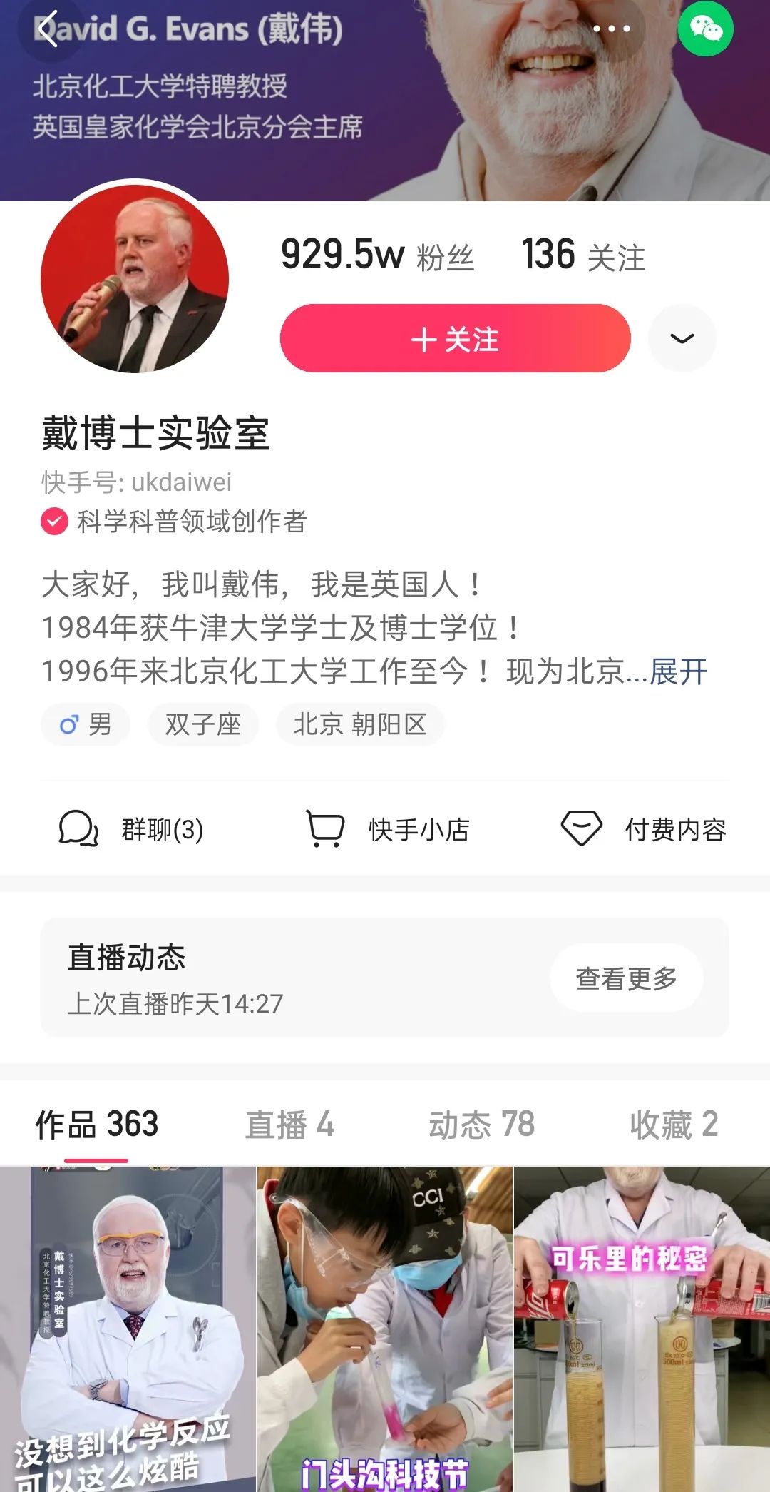 60岁出头的戴伟,是是英国皇家化学学会北京分会创始人及上任北京分会主席、北京化工大学特聘教授,他的另一个身份是,快手科普代言人。