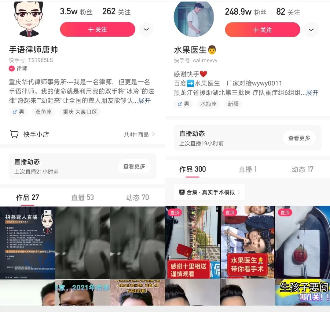 快手上还有一个用户水果医生,提及自己为什么要直播是这样说的,“有很多姐妹不好意思去医院,我会听她简单描述一下症状,再建议说该去哪些医院,去到了该挂什么科,不能让我的姐妹被坑。”他将自己的角色视作“每个人都想在医院有的熟人”,“很多人在医院没有熟人怎么办?这个时候我就站出来告诉你,上医院你应该往哪个方向走,去挂哪个科,怎么跟医生对话。”