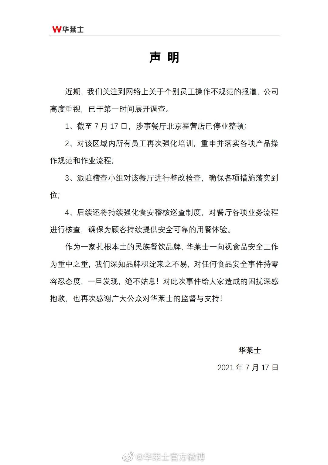 17日晚,华莱士回应称,截至7月17日,涉事餐厅北京霍营店已停业整顿,派驻稽查小组对该餐厅进行整改检查,同时对该区域内所有员工再次强化培训,重申并落实各项产品操作规范和作业流程。华莱士表示, 对此次事件给事件给大家造成的困扰深表抱歉。