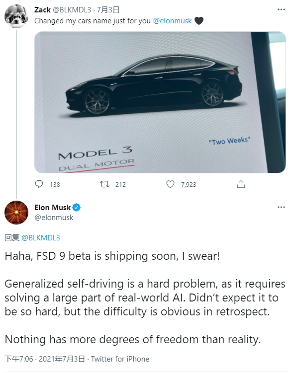 不过都2021年了,马斯克早就是打脸黑带选手了,他7月在推特上回复网友说:广义的自动驾驶是一个难题,因为它需要解决非常多的现实世界的人工智能问题。此前没想到这么难,但回想起来难度是显而易见的。
