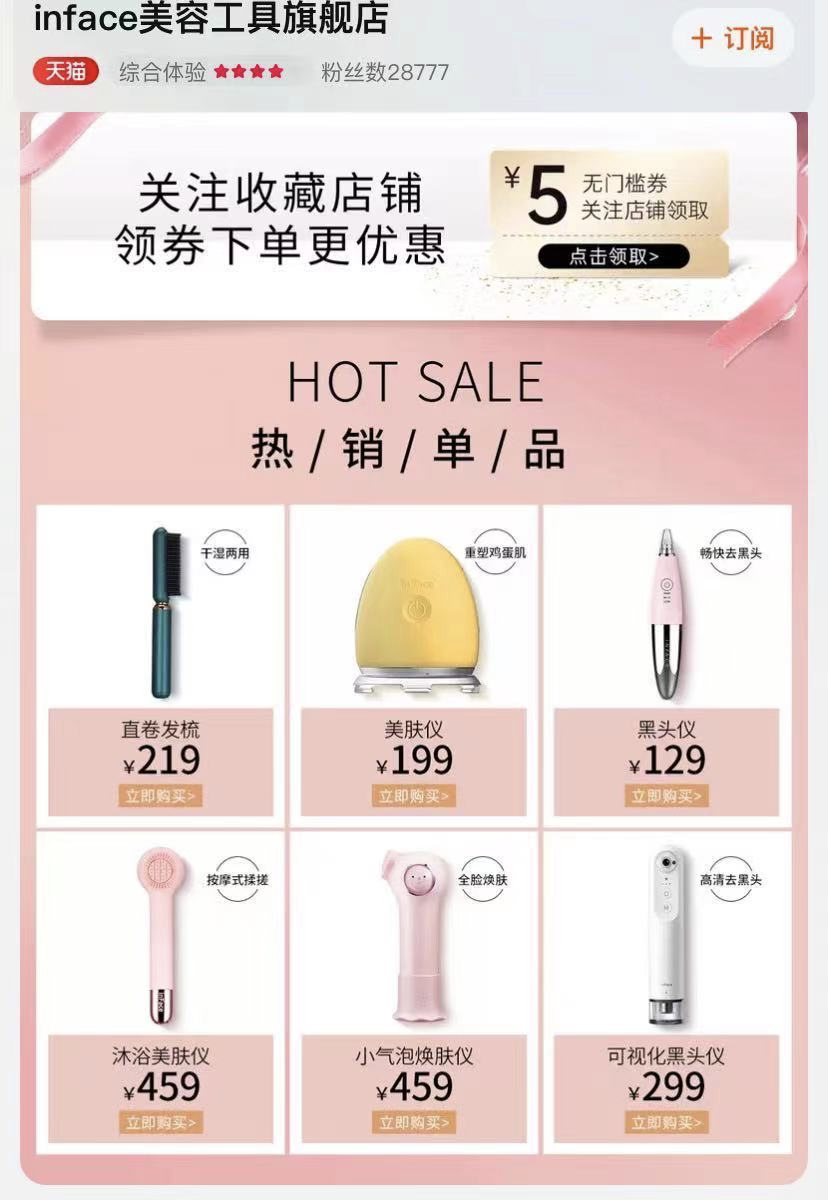 成立4年时间里,米谷智能的产品线包括直发梳、脱毛仪等毛发类产品、洁面仪等皮肤类产品以及射频仪、美眼仪等抗初老产品。在今年618活动中,inFace直发梳在造型梳/离子梳/电动梳品类交易榜中排名第一。
