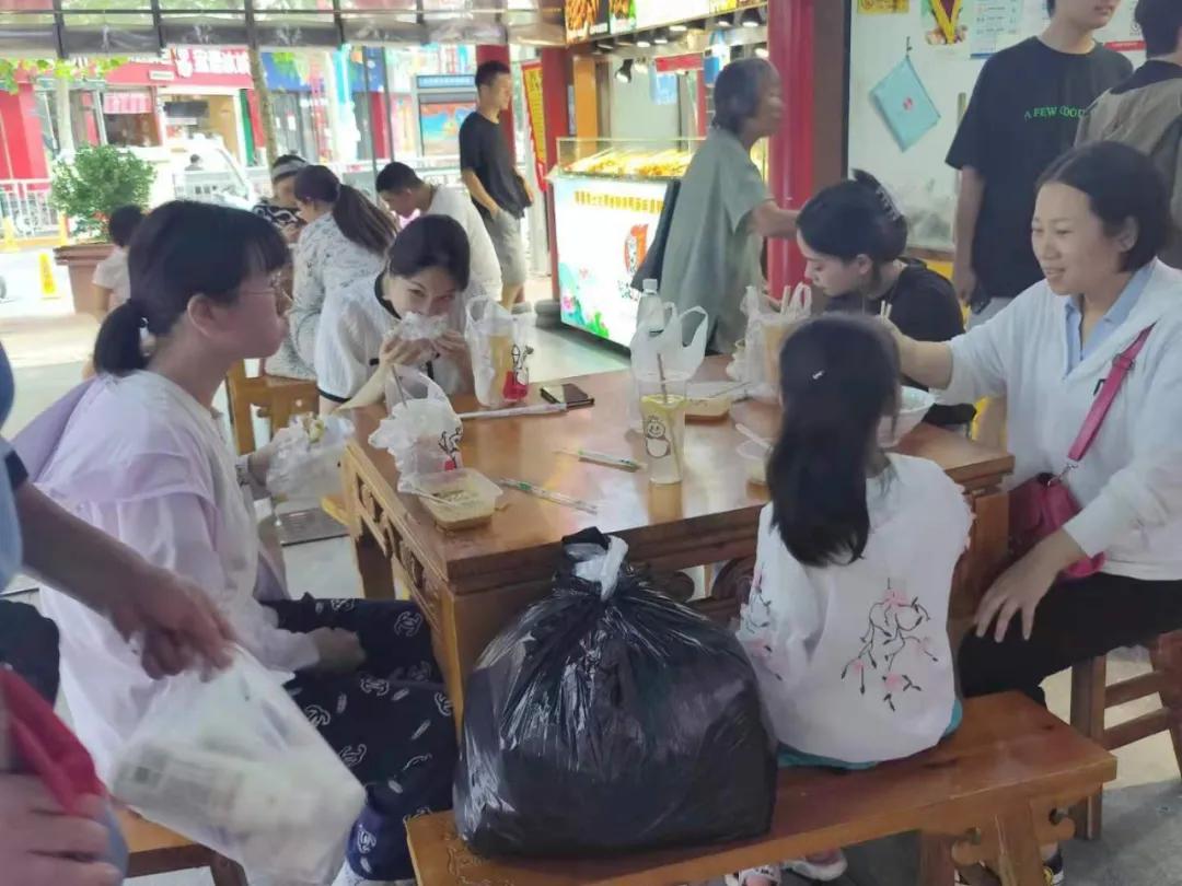 郑州二七区德化新街的一条小吃街上,一张餐桌围着五名顾客,每人手边都放一杯蜜雪冰城饮品,看起来,顾客们对蜜雪冰城是真爱。