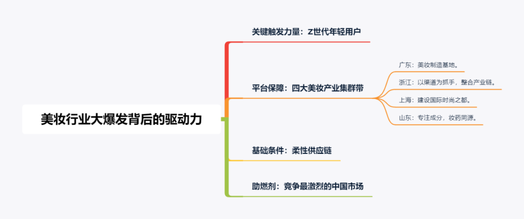 上游原料端和制造厂商的成长和发展,推动了美妆的多元化;渠道的升级,使得消费者的声音被更快、更准确地倾听;品牌的大爆发,使得市场竞争逐渐白热化,反推上游不断推陈出新,形成良性循环。