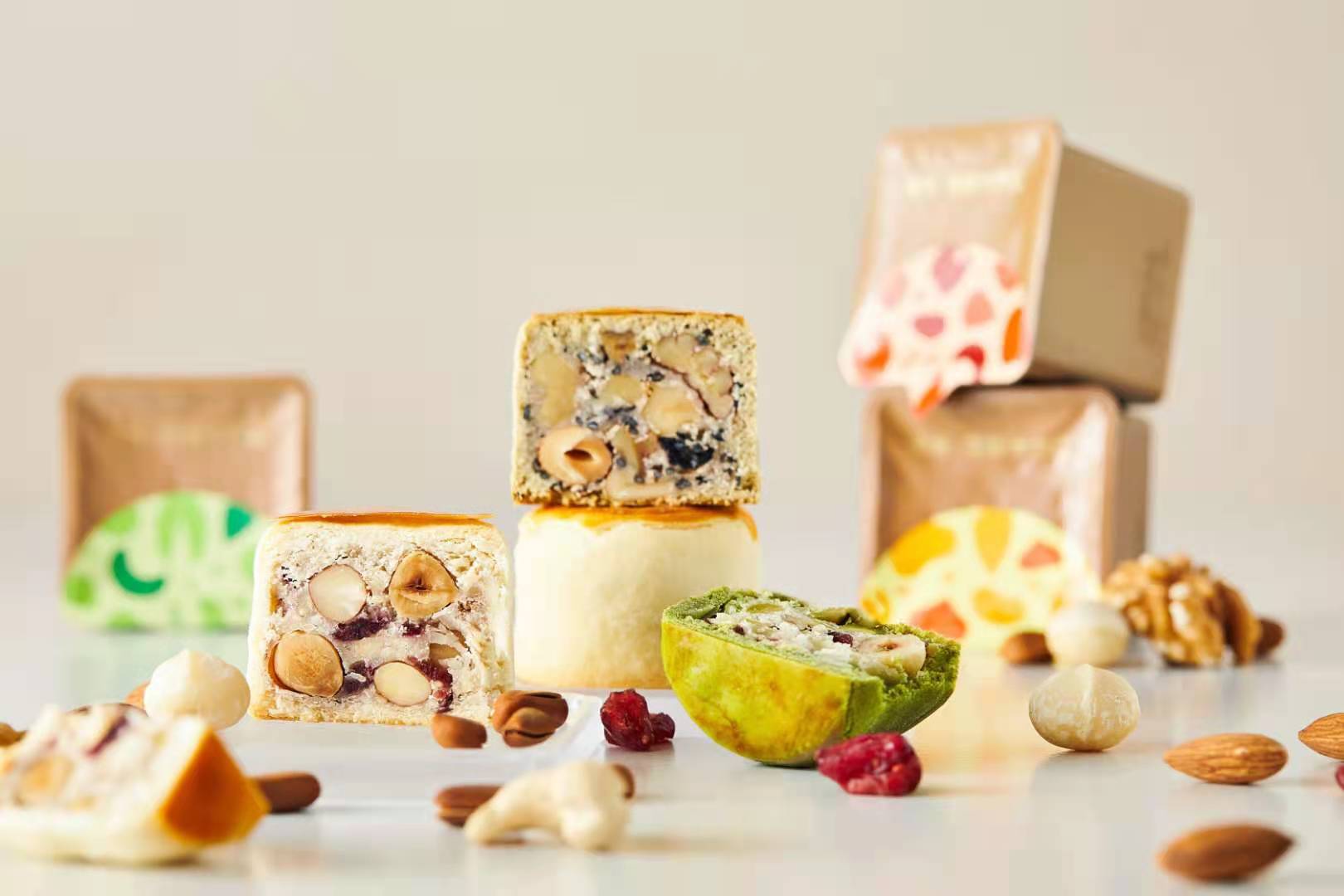 关茶新食礼的新,首先从原料端开始,所有的原材料都是从世界各地甄选采购,例如,奶酥十六仁月饼,其实是传统五仁月饼的升级,16种果仁和食材是来自6个国家10几个不同地区。