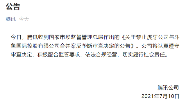 7月10日,市场监管总局根据反垄断法第28条、《经营者集中审查暂行规定》第35条规定,认为合并案将强化腾讯在游戏直播市场的支配地位,不利于市场公平竞争、可能减损消费者利益。之后,腾讯和斗鱼等也各自宣布中止合并。