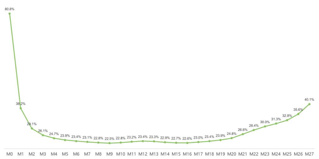2019年,梁昌霖公开了叮咚买菜复购率数据绘成的「微笑曲线」,叮咚买菜在2017年5月上线后稳定在20%以上,2018年5月高榕资本投资时,叮咚买菜月度复购率在23%左右。