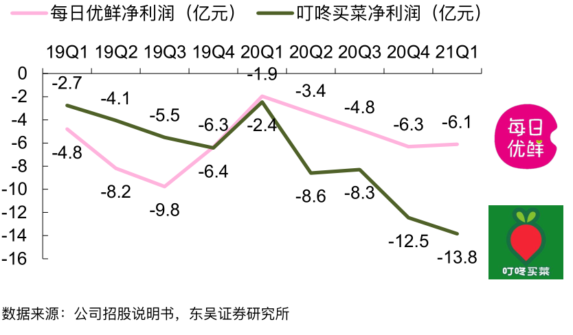2021年Q1,叮咚买菜净亏损13.8亿元,每日优鲜亏损6.1亿元,叮咚买菜和每日优鲜的净亏损率均在35%以上。