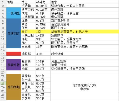 在他列出的表格里,坐拥百亿票房的黄渤只有0.75京,而吴亦凡则处于“神的领域”,微博平均转发有500京(即100万+)。