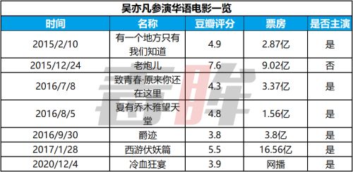尝到了流量甜头的吴亦凡,此后几年内一直在影视圈活动,先后和京圈、港圈导演合作,还和“流量电影创始人”郭敬明成功会晤,接连主演了《致青春·原来你还在这里》《爵迹》等四部影片,不过这些电影的豆瓣评分都没超过6分。