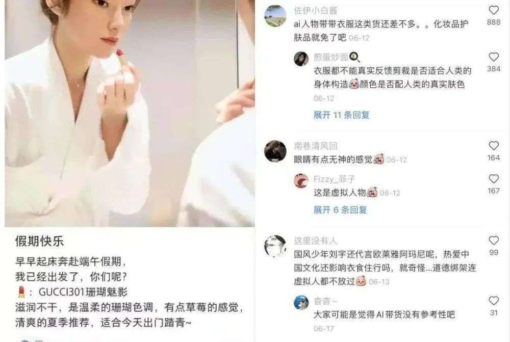 一方面,用户认为虚拟偶像带货化妆品和护肤品不妥,譬如有消费者质疑“不干你是咋知道的”;另一方面,由于形象被设定为喜欢京剧、毛笔字和太极的国风女孩,但第一次商务合作对象却是Gucci,这种“文不对题”的反差也让粉丝失望。
