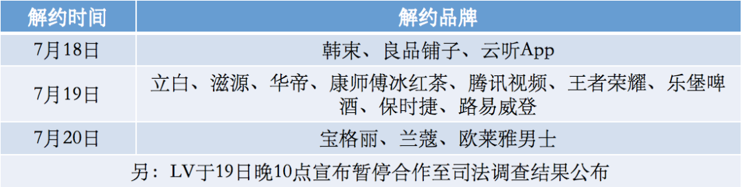 紧随其后,良品铺子和云听App等企业也在当晚宣布合作已终止。随着事态的持续发酵,分别有9家和3家企业在19日和20日做出解约决定。