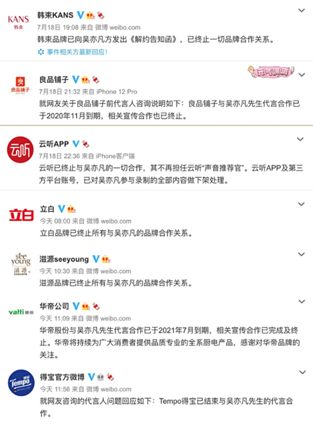 从被都美竹在微博上一顿神捶开始,吴亦凡已经丢掉了14个代言,包括奢侈品牌宝格丽、保时捷,只有LV以暂停合作的形式,宣布等到司法调查结束公布是否解约。