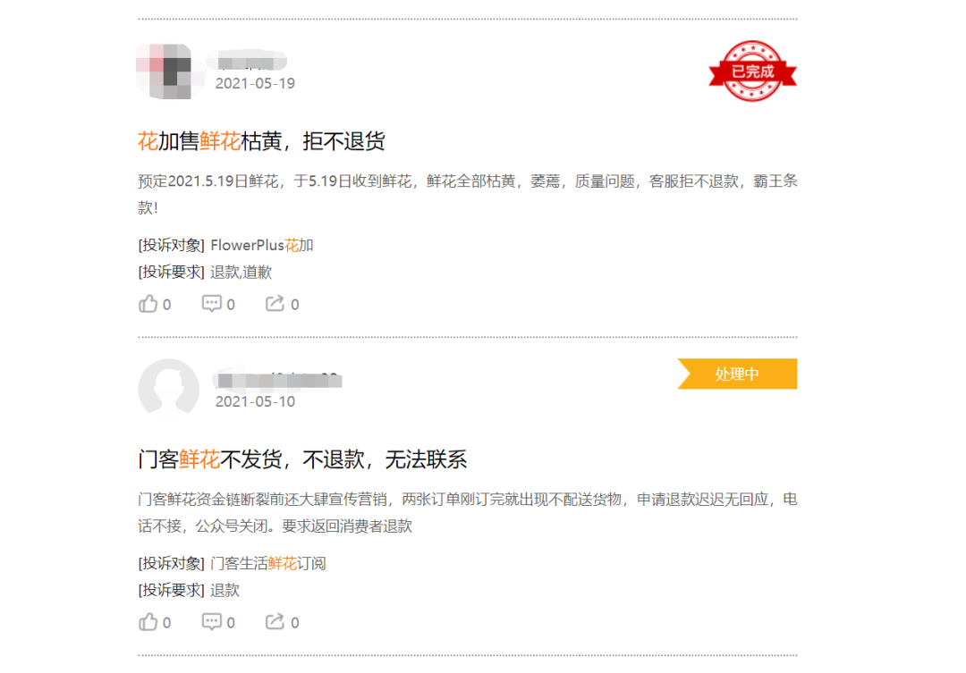 在黑猫投诉平台上,搜索“鲜花”关键词,投诉量达到数千条,其中投诉内容多为“不新鲜或破损枯萎”“配送不及时”“无人售后”“虚假宣传,花束搭配不好看”等。