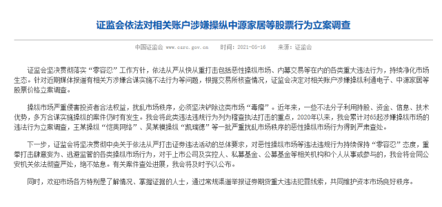 5月16日,证监会再次在官网发布公告,针对近期媒体报道有相关方涉嫌合谋实施不法行为等问题,根据交易所核查情况,证监会决定对相关账户涉嫌操纵利通电子、中源家居等股票价格立案调查。