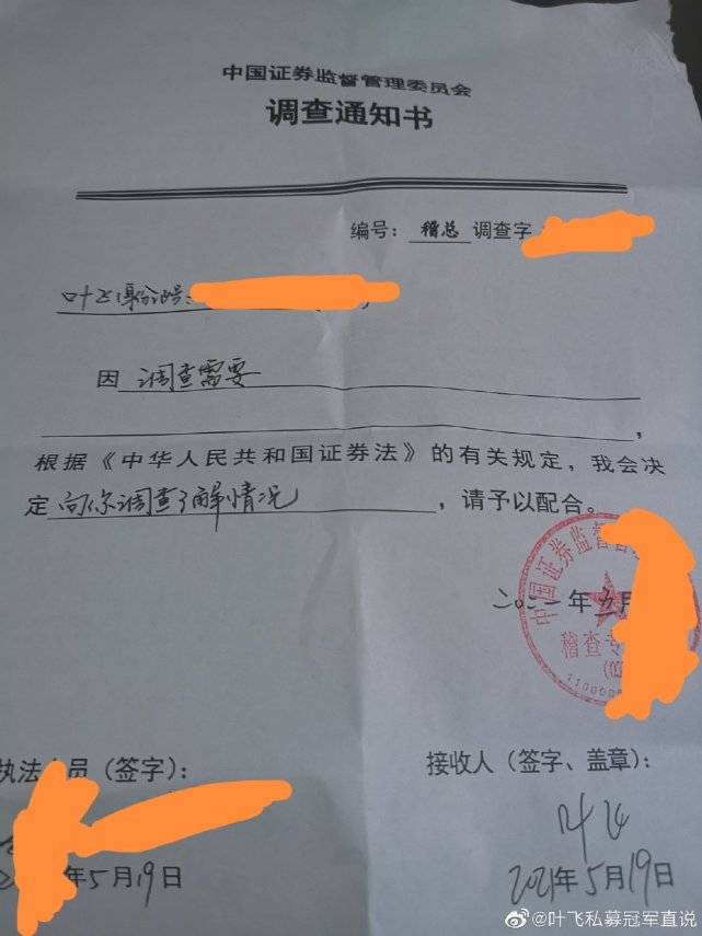 5月19日,叶飞在微博发文,“告别了上海证监局。告别了证监会稽查总队某领导”,表示已经和证监会的相关领导进行了会面,并晒出了证监会的调查通知书照片,但具体谈话的内容没有进一步透露。