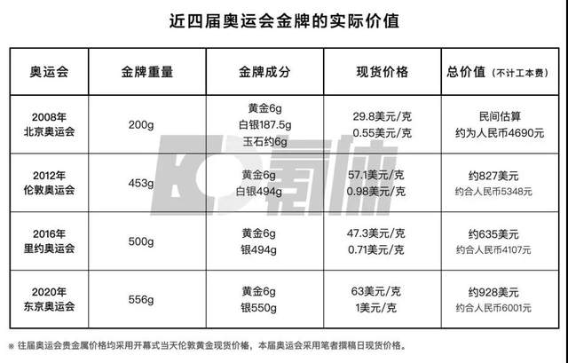我们通过近四届奥运会的金牌重量与成分,并结合当时贵金属现货价格,为大家进行金牌实际价值盘点。如果只计算贵金属的实际价值,一块金牌的价值区间,约在人民币4000元-6000元之间。