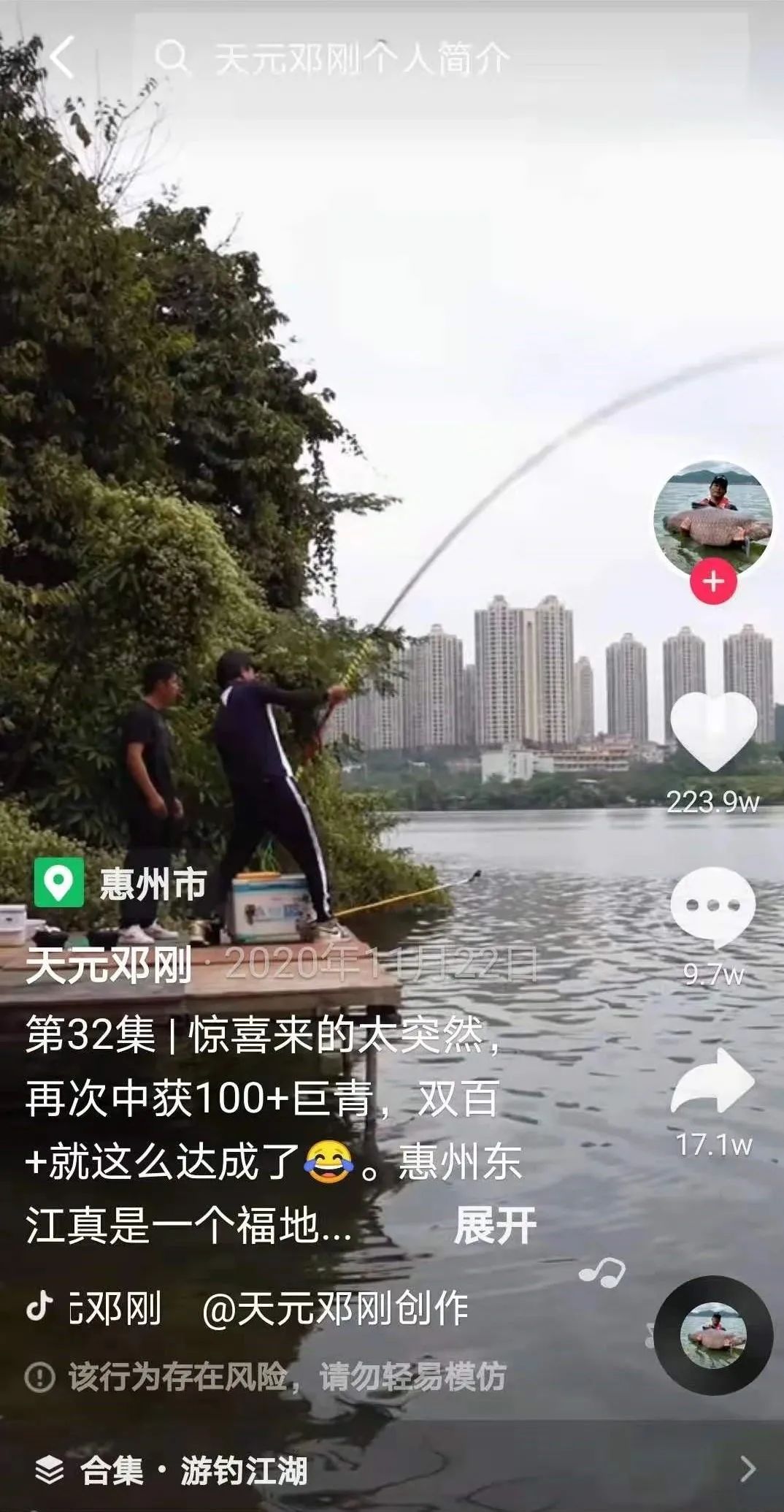 还有一位钓鱼大佬邓刚,凭借一系列黑坑钓鱼(在私人场地钓鱼,需要给老板缴纳一定的入场费)视频直接火出圈,一个月内涨粉千万。