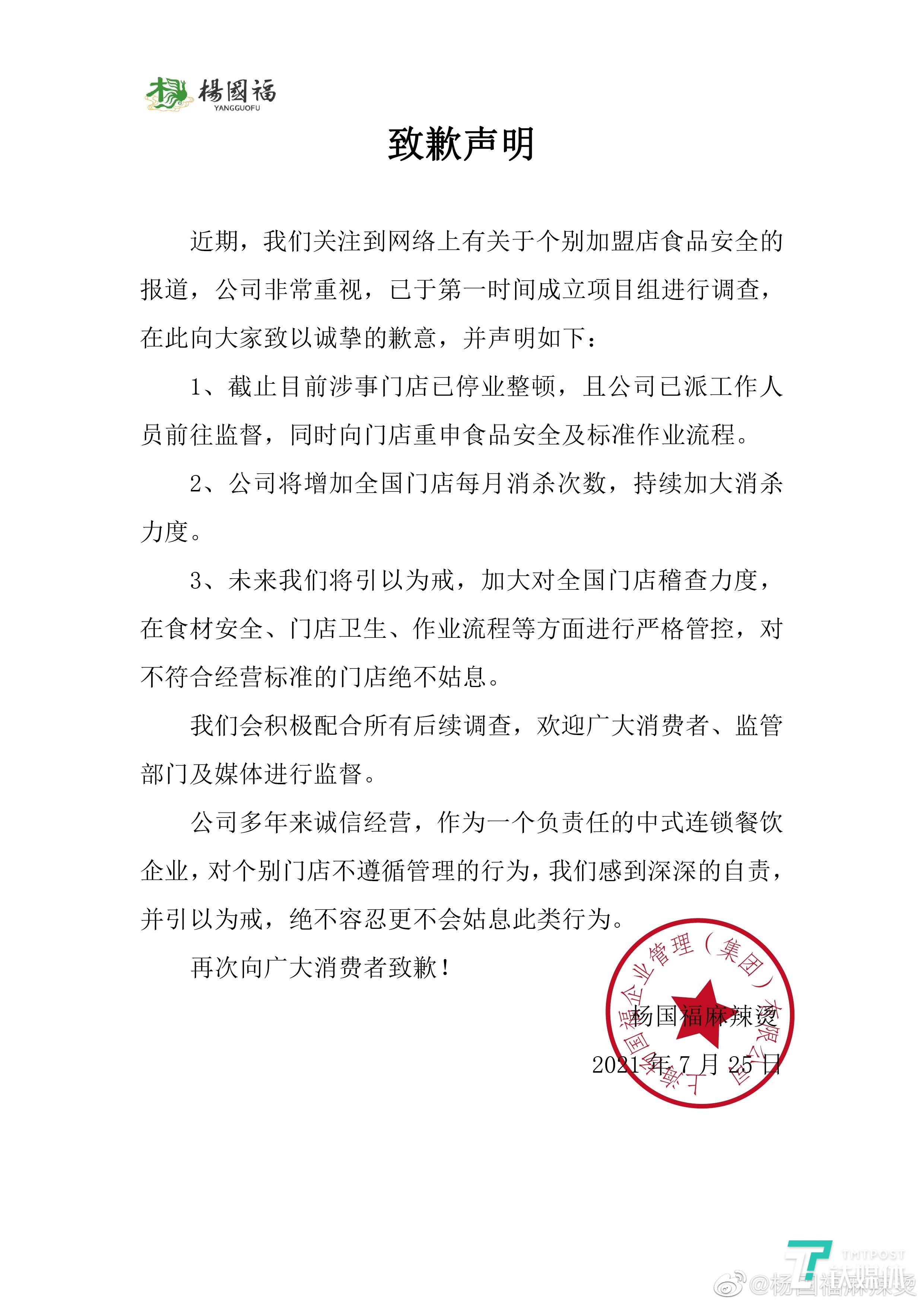 7月25日,杨国福麻辣烫微博发布致歉声明,称涉事门店已经停业整顿,公司已派工作人员前往监督。