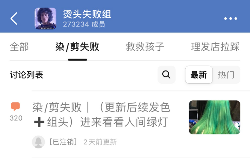 豆瓣烫头失败组拥有超过27万名成员,很多用户都曾分享过在理发店的惨痛经历,有人花费900元、耗时4小时染了黑茶色后仿佛无事发生,还有人想要孔雀绿,却被托尼变成了“人间绿灯”。